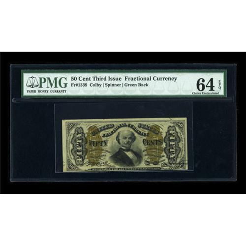 <B>Fr. 1339 50c Third Issue Spinner Type II PMG Choice Uncirculated 64 EPQ.</B></I> Broad margins frame this Spinner on three sides.<BR><BR><b>Shipping:</b> Coins & Currency (<a target="_blank" href="http://www.heritageauctions.com/common/shipping.php">view shipping information</a>)