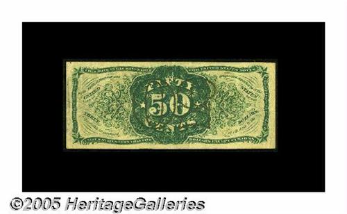 <B>Fr. 1339 Milton 3R50.21h 50¢ Third Issue Spinner Type II Inverted Back Surcharge Extremely Fine.</B></I> One of only two known. The paper is a bit dark, and there is a tear at the top of the center fold, but the note is overall quite respectable. This piece is plated, both sides, on page 114 of the Encyclopedia. It realized over $600 eight years ago, and it should be worth about double that now.