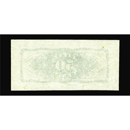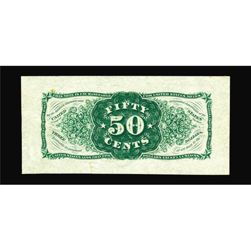 <B>Fr. 1339SP 50¢ Third Issue Spinner Type II Back Choice About New.</B></I> Two minor age spots and an extremely light corner bend are all that hold this rare Type II Spinner back from the Gem New grade. It has all its original paper embossing, beautifully wide margins, and like all the known examples, it lacks the bronze "50" overprint. About fifteen or so examples exist in all grades, and this one in spite of its minor flaws has brightness and originality that carries it well up into the top half for overall quality.