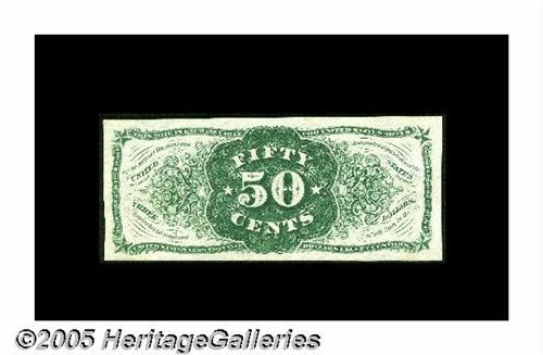 <B>Fr. 1339SP Milton 3S50R.3 50¢ Third Issue Narrow Margin Spinner Type II Back Gem New.</B></I> The finest example we've seen of this number, which Tom O'Mara acquired when he purchased the Doug Hales Collection. Doug bought the note years earlier from Florida Dealer Sid Smith. It is an absolutely pristine piece on pure white paper with deep original embossing and margins far superior to those usually seen. If you are looking for a premium example of a Type II Spinner specimen, this should be your note.