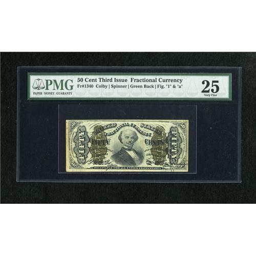 <B>Fr. 1340 50c Third Issue Spinner Type II PMG Very Fine 25.</B></I> This is a very nice example of the scarcer "1" and "a" Type II Spinner note. The paper is fresh and bright and, but for a light tone in the left border, totally problem free. It looks a touch better than the grade assigned.<BR><BR><b>Shipping:</b> Coins & Currency (<a target="_blank" href="http://www.heritageauctions.com/common/shipping.php">view shipping information</a>)