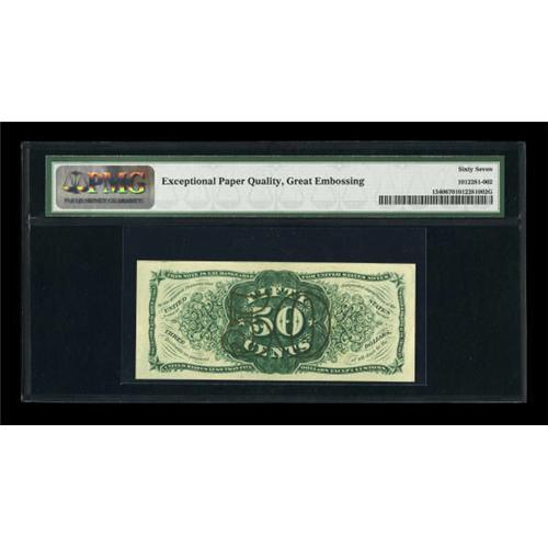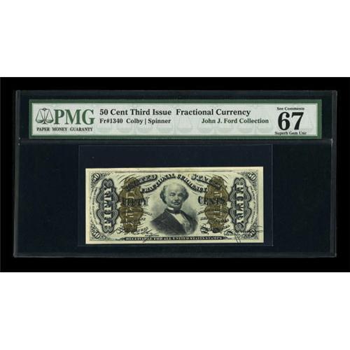 <B>Fr. 1340 50c Third Issue Spinner Type II PMG Superb Gem Unc 67 EPQ.</B></I> Three important elements boost the eye appeal of this Superb Gem to the limits. First is four broad margins, followed by great front to back centering. Lastly is deep embossing that is plainly evident though the third party holder. The paper is as bright as one will find for the issue. PMG indicates this piece was once part of the John J. Ford holdings.<BR><BR><b>Shipping:</b> Coins & Currency (<a target="_blank" href="http://www.heritageauctions.com/common/shipping.php">view shipping information</a>)