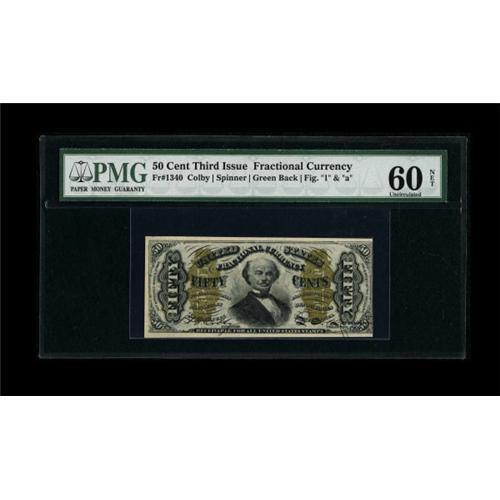 <B>Fr. 1340 50c Third Issue Spinner Type II PMG Uncirculated 60 Net.</B></I> PMG has commented about some restoration that is well done on this popular green Back that is tight along the right side.<BR><BR><b>Shipping:</b> Coins & Currency (<a target="_blank" href="http://www.heritageauctions.com/common/shipping.php">view shipping information</a>)