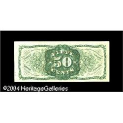 Fr. 1341 50c Third Issue Spinner Type II Gem New. A ful <B>Fr. 1341 50c Third Issue Spinner Type II Gem New.</B></I> A fully original splendid representative of this tough type. A note that was part of the Gengerke collection in the mid 1990s as Lot 150. It has reflectively brilliant bronze, excellent original embossing and tremendous eye appeal. <BR><BR><B>Important notice:</B> Heritage usually auctions material at the rate of 200-250 lots per hour. On some occasions eBay Live bid software or the Internet may not be able to keep up with the pace of the auction. We recommend placing a realistic absentee bid now as insurance to avoid disappointment. Occasionally the auctioneer may eliminate or reject an eBay Live bid, and the auctioneer may also reopen a lot after the close of the eBay live bidding (usually because we missed an audience bid), and may reject your bid even if it shows you as the winning bidder. By bidding via eBay Live, you agree that Heritage may award the lot to another bidder at its sole discretion under the circumstances described above or any other reasonable circumstances. Since eBay bids are not shown to us until we open the lot on the floor, we treat those bids just like floor bids. In most cases the floor responds before the eBay bid is presented to us, due to Internet lag time, so for consistency we have made it a policy that floor bids are always considered first over tie eBay live bids. Also please note that all Heritage lots purchased through eBay Live carry a 20% Buyer's Premium. Please make sure you read the Terms and Conditions before you bid. This lot is being auctioned in conjunction with a live floor auction by Heritage Galleries & Auctioneers. All final auction and invoice information will be supplied by Heritage Galleries & Auctioneers, and all other information should be considered preliminary. Lot:15443