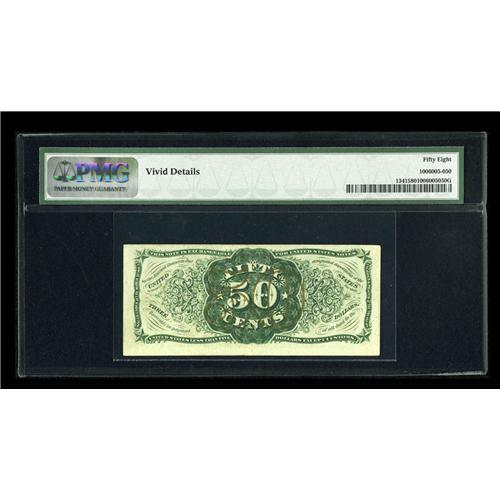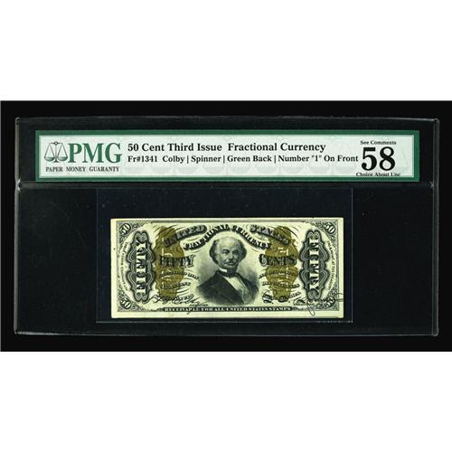<B>Fr. 1341 50c Third Issue Spinner Type II PMG Choice About Unc 58.</B></I> A perfectly natural note displaying deep original embossing. The certification service adds the additional comment, "Vivid details," an observation which is right on the money. A note likely to sell for a premium above its technical grade level.