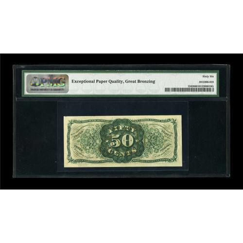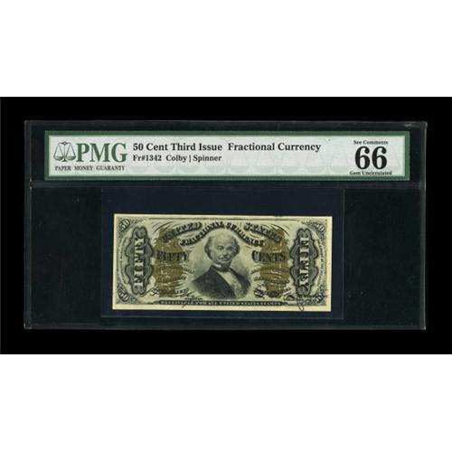 <B>Fr. 1342 50¢ Third Issue Spinner Type II PMG Gem Uncirculated 66 EPQ.</B></I> A well margined, handsome example of the second scarcest of the Type II Spinners. Along with the coveted Exceptional Paper Quality comment, PMG has added the second positive, "Great Bronzing." A very hard number to find this nice.<BR><BR><b>Shipping:</b> Coins & Currency (<a target="_blank" href="http://www.heritageauctions.com/common/shipping.php">view shipping information</a>)