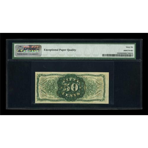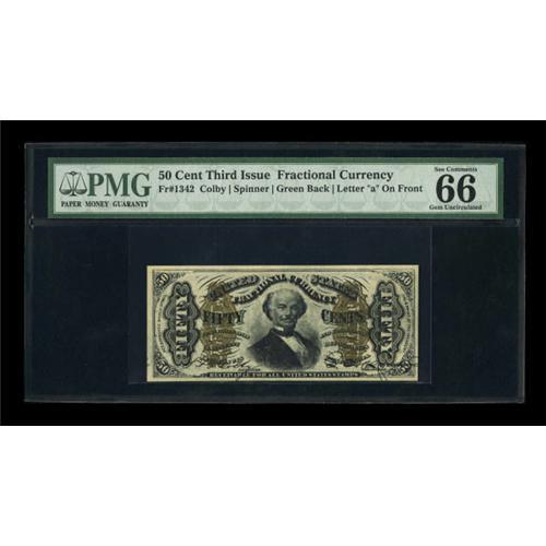 <B>Fr. 1342 50c Third Issue Spinner Type II PMG Gem Uncirculated 66 EPQ.</B></I> Solid, even margins are noted on the face and were the back centered a touch more to the right, this piece would have all the eye appeal of a Superb piece.<BR><BR><b>Shipping:</b> Coins & Currency (<a target="_blank" href="http://www.heritageauctions.com/common/shipping.php">view shipping information</a>)