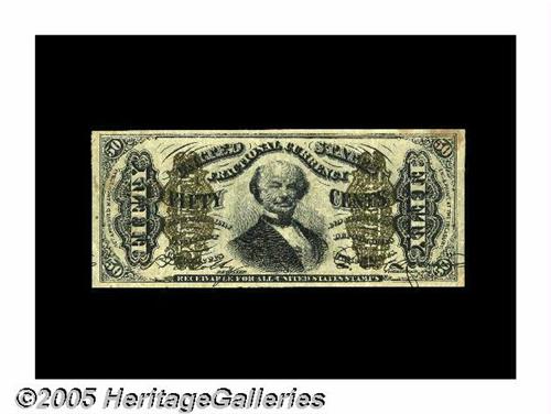 <B>Fr. 1342 Milton 3R50.21i 50¢ Third Issue Spinner Type II Inverted Back Surcharge Very Fine.</B></I> When we last sold this note in our January 1997 Sale, it was described, "This lovely note, which is flawless for the grade, is exceptionally well margined, and the inverted bronze overprint is bold and clear. It's the plate note from page 114 of the Encyclopedia. It was unique when that book was printed, and we believe it remains so to this day." Still unique to our knowledge, the note realized $1,320 in 1997.