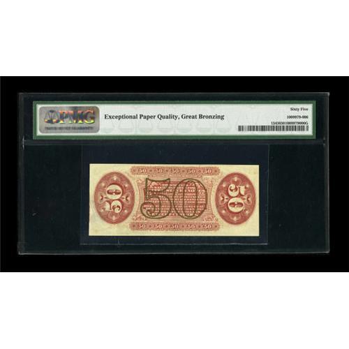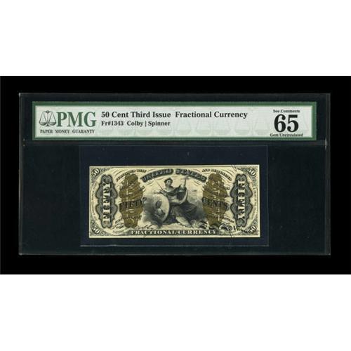 <B>Fr. 1343 50¢ Third Issue Justice PMG Gem Uncirculated 65 EPQ.</B></I> Red Back Justices in 65EPQ will always remain scarce. To this point, PMG has graded four examples at this level, with none higher. The note has terrific color, bright bronze and strong eye appeal.<BR><BR><b>Shipping:</b> Coins & Currency (<a target="_blank" href="http://www.heritageauctions.com/common/shipping.php">view shipping information</a>)