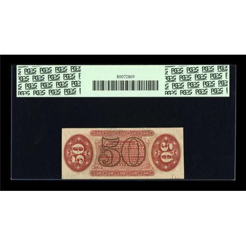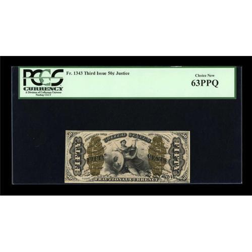 <B>Fr. 1343 50c Third Issue Justice PCGS Choice New 63PPQ.</B></I> A well embossed, brightly colored Red Back Justice that would have clearly made the Gem grade with just a hair more margin. While this pretty note has at least <I>some </B></I>margin at all points, the left and part of the top come quite close to the frame line. The brilliant red back is beautifully centered.<BR><I>From The Thomas M. Flynn Collection</B></I><BR><BR><b>Shipping:</b> Coins & Currency (<a target="_blank" href="http://www.heritageauctions.com/common/shipping.php">view shipping information</a>)