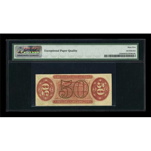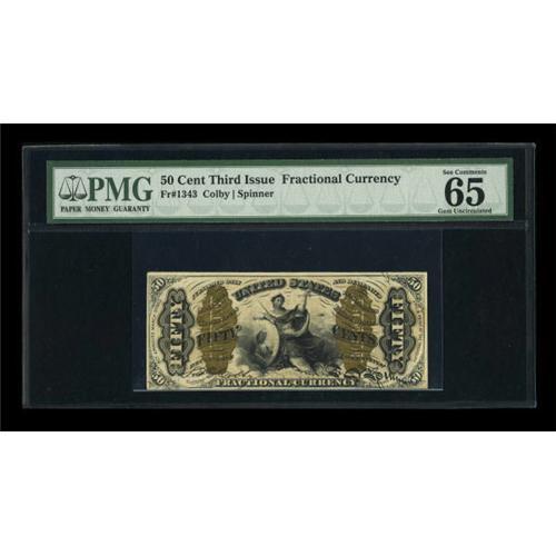 <B>Fr. 1343 50c Third Issue Justice PMG Gem Uncirculated 65 EPQ.</B></I> Perfectly original embossing is noted on this sufficiently margined Justice. The bronzing is as boldly printed as one will find on a Fractional.<BR><BR><b>Shipping:</b> Coins & Currency (<a target="_blank" href="http://www.heritageauctions.com/common/shipping.php">view shipping information</a>)