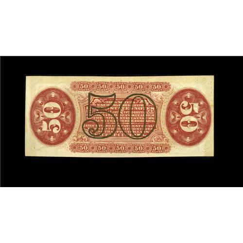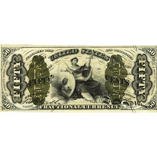 <B>Fr. 1343 50c Third Issue Justice Very Choice New.</B></I> Unusually well margined, with good original embossing, bright colors and no problems of any kind. The back centering is excellent, and the face has three unusually large margins and one typically tight margin. But for that single tight margin, this pretty Justice would rate the Gem grade.