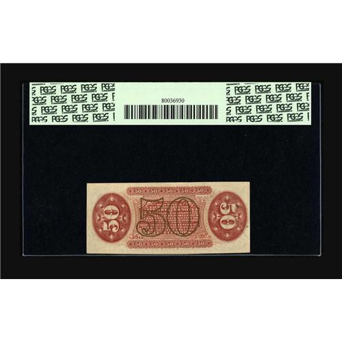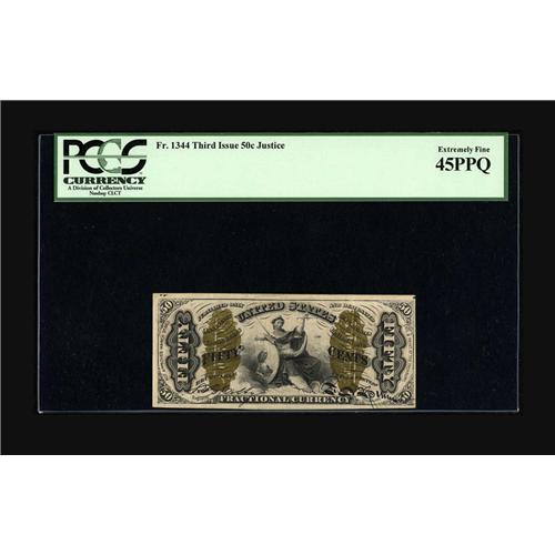 <B>Fr. 1344 50¢ Third Issue Justice PCGS Extremely Fine 45PPQ.</B></I> This is one of the most visually pleasing "1" and "a" Red Back Justices that we have had the pleasure of handling. It has excellent margins on both sides, razor-sharp printing, bright bronze and perfect color. Three of the face margins are outlandishly large, and the much smaller right face margin would be large enough to support the Gem grade. But for a few extremely light soft folds and some minor as-made spots in the top margin, this rare piece would be Superb. An exceptional example of a rare and extremely popular number. This is the description we used when our consignor purchased the note nearly a decade ago. At that time, we graded the note XF-AU--a grade with which PCGS clearly concurs. This piece in our opinion is far more desirable than many of the technical UNCs of this number.<BR><I>From The Bill and Kathy Stella Currency Collection</B></I><BR><BR><b>Shipping:</b> Coin/Currency (<a target="_blank" href="http://www.heritageauctions.com/common/shipping.php">view shipping information</a>)