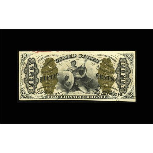 <B>Fr. 1344 50¢ Third Issue Justice Superb Gem New.</B></I> Incredible deep, original embossing, bold, flashy color, fully bright bronze and incomparable eye appeal all combine on this spectacular "1" and "a" Justice. This cataloger has seen and handled virtually every 1344 that has crossed the market in the last 30 years. This one compares favorably with the very best of them. It lacks the heavy, natural pinch fold that is found at the top center of most pieces of this number, and the pristine surfaces are interrupted only by extremely minimal press-bed ink at the very top edge and the right end of the back. A gorgeous piece that will likely wind up at the top of the third-party census should it ever be sent in.