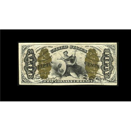 <B>Fr. 1344 50¢ Third Issue Justice Superb Gem New.</B></I> Three of the four margins on this gorgeous "1" and "a" Red Back Justice are utterly outsize, and the fourth, although smaller than the others, is more than large enough to sustain the Superb grade. The paper is 100% fully bright, as are the bronze and inks, and the note has perfect back centering as well as all its deep, original embossing. In spite of its rarity, there are a number of Gems known for Fr. 1344. This one is right up there with the very best of them, and can be no worse than tied for finest known.