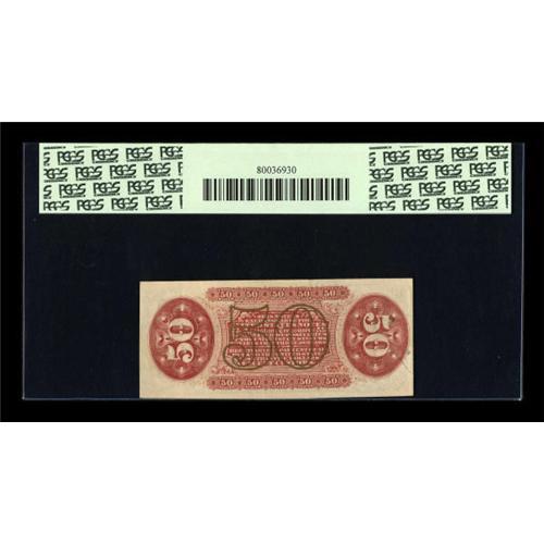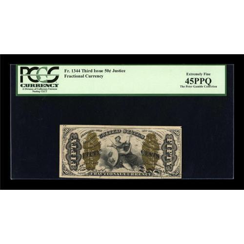 <B>Fr. 1344 50c Third Issue Justice PCGS Extremely Fine 45PPQ.</B></I> From our 2007 FUN Signature auction of the <I>Bill and Kathy Stella Currency Collection </B></I>where the description read, "This is one of the most visually pleasing "1" and "a" Red Back Justices that we have had the pleasure of handling. It has excellent margins on both sides, razor-sharp printing, bright bronze and perfect color. Three of the face margins are outlandishly large, and the much smaller right face margin would be large enough to support the Gem grade. But for a few extremely light soft folds and some minor as-made spots in the top margin, this rare piece would be Superb. An exceptional example of a rare and extremely popular number." This is the description we used when our consignor purchased the note nearly a decade ago. At that time, we graded the note XF-AU--a grade with which PCGS clearly concurs. This piece in our opinion is far more desirable than many of the technical UNCs of this number.<BR><I>From The Peter Gamble Collection.</B></I><BR><BR><b>Shipping:</b> Coins & Currency (<a target="_blank" href="http://www.heritageauctions.com/common/shipping.php">view shipping information</a>)