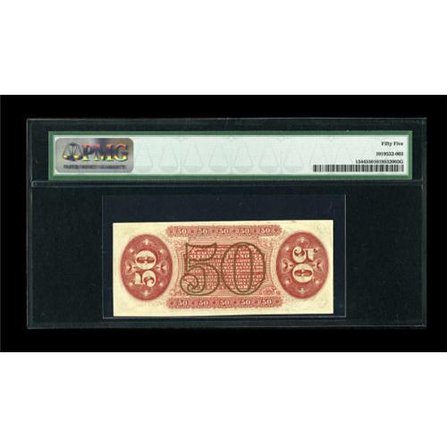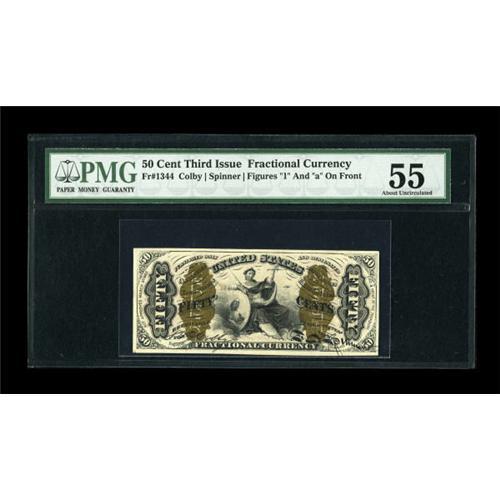<B>Fr. 1344 50c Third Issue Justice PMG About Uncirculated 55.</B></I> A scarce variety that carries the "1" and "a" figures on the face. It is nicely margined with bright color and plenty of eye appeal worthy of a strong bid. An exceptional example of a rare and extremely popular number. The handling is minimal as the note faces up well.<BR><BR><b>Shipping:</b> Coins & Currency (<a target="_blank" href="http://www.heritageauctions.com/common/shipping.php">view shipping information</a>)