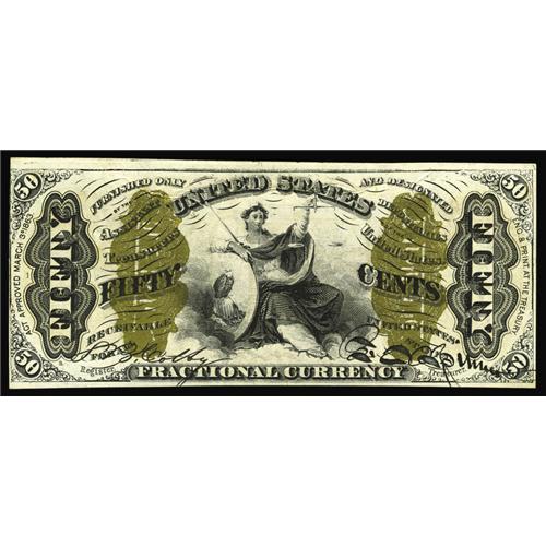 <B>Fr. 1344 50c Third Issue Justice Very Choice New.</B></I> Incredible deep, original embossing, bold, flashy color, fully bright bronze and incomparable eye appeal all combine on this spectacular "1" and "a" Justice. The margins which could be a touch larger are sufficient, and there is an as made crinkle in the paper near the title UNITED STATES.