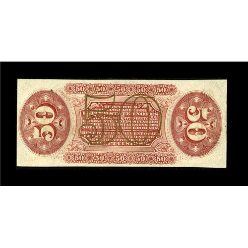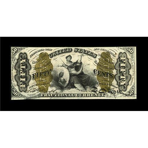 <B>Fr. 1345 50c Third Issue Justice New.</B></I> The technical grade does not do justice (no pun intended) to the sheer beauty of this Red Back note. Although the top and left margins are both tightly trimmed, the bronzing is bright, the ink colors are bold and every minute aspect of the embossing can be seen on both sides. There is a small natural spot to the right of the bronzing which should not be misconstrued as a fault. For the grade, this Justice is as nice as they come.<BR><BR><b>Shipping:</b> Coins & Currency (<a target="_blank" href="http://www.heritageauctions.com/common/shipping.php">view shipping information</a>)