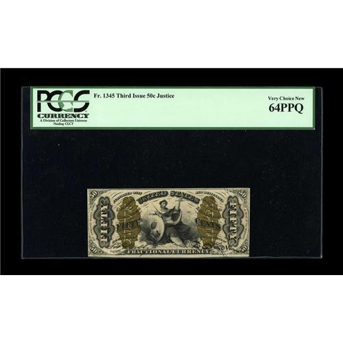 <B>Fr. 1345 50c Third Issue Justice PCGS Very Choice New 64PPQ.</B></I> The bronzing is very deep on this Red Backed Justice which has nice back centering. Expect the hammer to fall in the area of . . .<BR><BR><b>Shipping:</b> Coins & Currency (<a target="_blank" href="http://www.heritageauctions.com/common/shipping.php">view shipping information</a>)