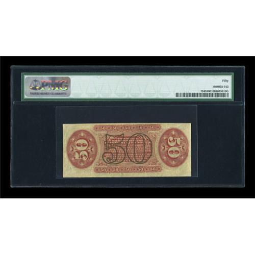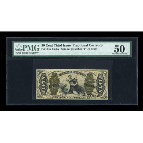 <B>Fr. 1345 50c Third Issue Justice PMG About Uncirculated 50.</B></I> A scarcer Red Back Justice number with the design figure "1" on the face. The margins are excellent for the type.<BR><BR><b>Shipping:</b> Coins & Currency (<a target="_blank" href="http://www.heritageauctions.com/common/shipping.php">view shipping information</a>)