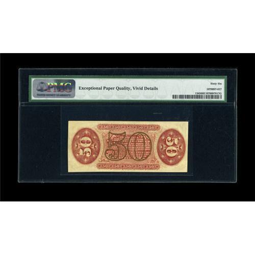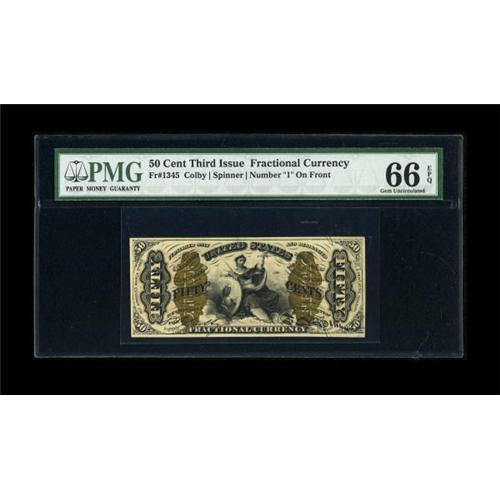 <B>Fr. 1345 50c Third Issue Justice PMG Gem Uncirculated 66 EPQ.</B></I> A gorgeous Red Back Justice and a tougher number besides. The ink colors are ideal as noted on the holder, the bronze quite bright, the original embossing pronounced and the note, unlike the overwhelming majority of Justices, has pretty even margins all the way around. A very difficult number to find this nice.<BR><BR><b>Shipping:</b> Coins & Currency (<a target="_blank" href="http://www.heritageauctions.com/common/shipping.php">view shipping information</a>)