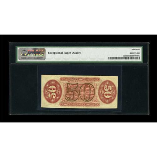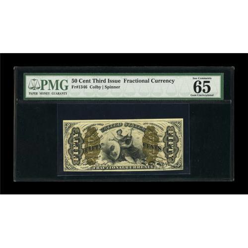 <B>Fr. 1346 50¢ Third Issue Justice PMG Gem Uncirculated 65 EPQ.</B></I> This Red Back "a" Justice is the only Gem PMG example of this number, graded at the 65 EPQ level with none higher. There is a single 64, but it is not EPQ. The note has exceptional margins for the number, along with bold, bright color and embossing that can be easily seen through the third-party holder.<BR><BR><b>Shipping:</b> Coins & Currency (<a target="_blank" href="http://www.heritageauctions.com/common/shipping.php">view shipping information</a>)