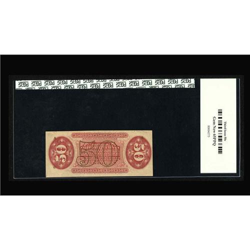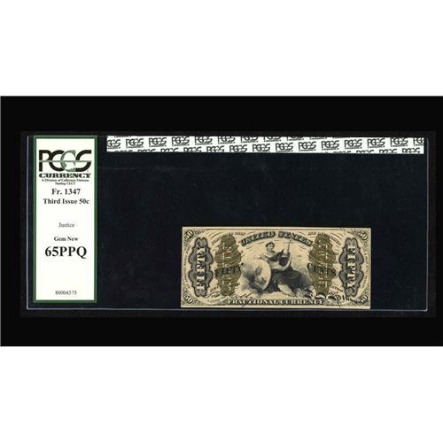 <B>Fr. 1347 50¢ Third Issue Justice PCGS Gem New 65PPQ.</B></I> A lovely Red Back Justice with exceptional centering, great color and original embossing that is easily seen through the third-party holder. Not a lot of Red Back Justices are going to wind up in 65PPQ holders.