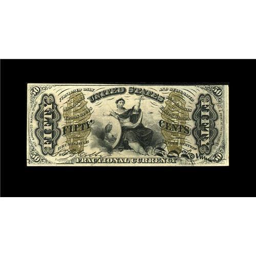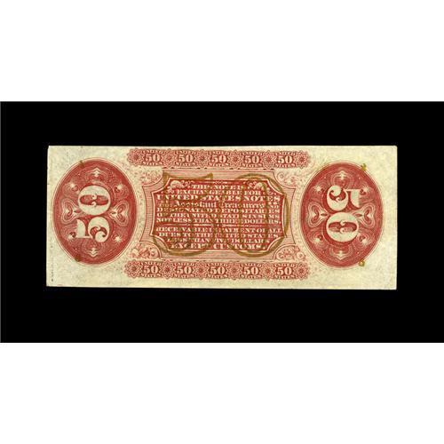 <B>Fr. 1347 50c Third Issue Justice New.</B></I> A very attractive red back Justice which has bright colors and bold printing. If the top margin did not run along the frame line we would not hesitate to qualify this note as Choice New.