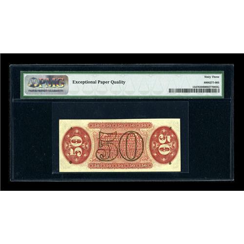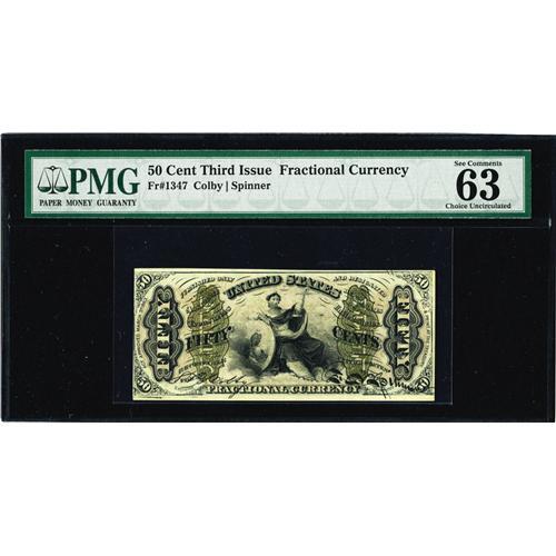 <B>Fr. 1347 50c Third Issue Justice PMG Choice Uncirculated 63 EPQ.</B></I> The front to back centering, paper quality, embossing, and color are all perfect, thus only the slim margins hold this gorgeous Justice away from a higher grade.