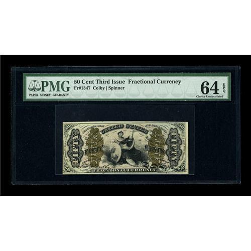 <B>Fr. 1347 50c Third Issue Justice PMG Choice Uncirculated 64 EPQ.</B></I> This pleasing Justice remains quite bright and is well embossed. Better margins would have raised the grade on this pretty piece.<BR><BR><b>Shipping:</b> Coins & Currency (<a target="_blank" href="http://www.heritageauctions.com/common/shipping.php">view shipping information</a>)
