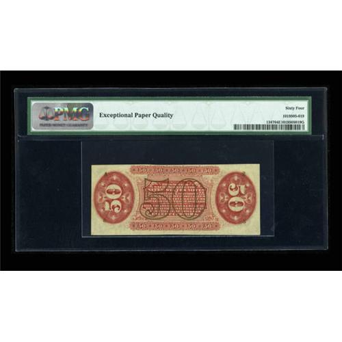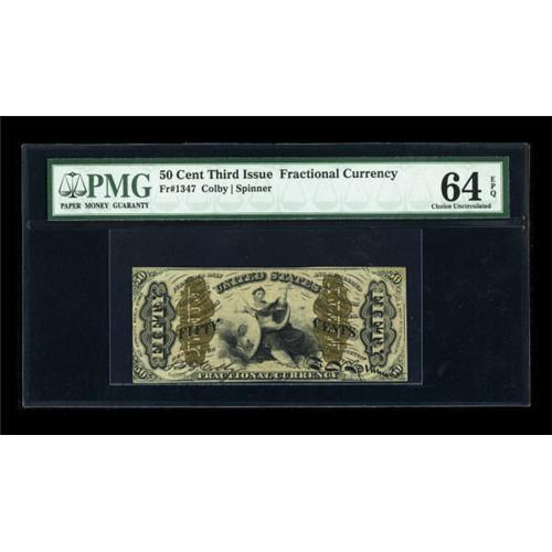 <B>Fr. 1347 50c Third Issue Justice PMG Choice Uncirculated 64 EPQ.</B></I> Deep embossing is clearly seen on the back of this bold and original note. The right margin intrudes slightly into the design, but does little to affect the overall eye appeal.<BR><BR><b>Shipping:</b> Coins & Currency (<a target="_blank" href="http://www.heritageauctions.com/common/shipping.php">view shipping information</a>)