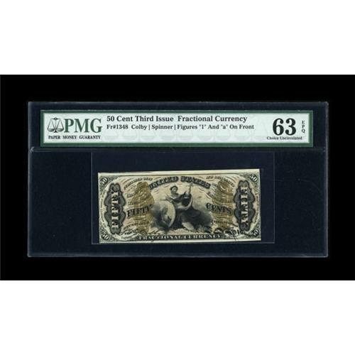 <B>Fr. 1348 50c Third Issue Justice PMG Choice Uncirculated 63 EPQ.</B></I> This is simply a stunning representative in wonderful condition. It is absolutely original and utterly unmolested. The PMG comments of great color and vivid detail are certainly appropriate for this outstanding example. <BR><BR><b>Shipping:</b> Coins & Currency (<a target="_blank" href="http://www.heritageauctions.com/common/shipping.php">view shipping information</a>)