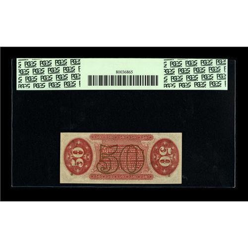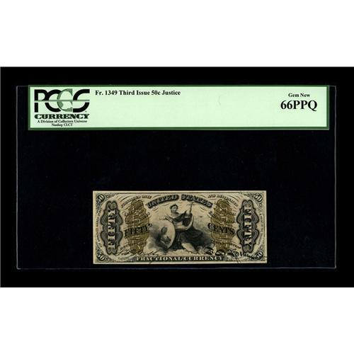<B>Fr. 1349 Milton 3R5.5b 50¢ Third Issue Justice PCGS Gem New 66PPQ.</B></I> From our O'Mara sale where it was cataloged as, "An essentially flawless Justice with unbelievable margins, perfect color, bright bronze and deep, original embossing. These superlatives become overused when describing a run of Justices as nice as these, but there is simply no way around it. The note is as close to a perfect Red Back Justice as any we have ever seen. Incredible." We felt that way then and still feel this way now about it but unfortunately the third party service didn't.<BR><I>From The Bill and Kathy Stella Currency Collection</B></I><BR><BR><b>Shipping:</b> Coin/Currency (<a target="_blank" href="http://www.heritageauctions.com/common/shipping.php">view shipping information</a>)