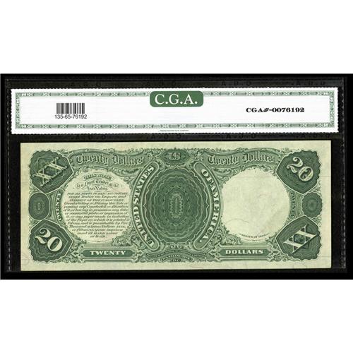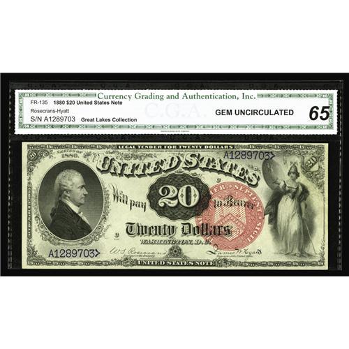 <B>Fr. 135 $20 1880 Legal Tender CGA Gem Uncirculated 65.</B></I> Only about 50 examples of this number are known, most of which are well circulated. This one appears to have earned its grade and apparently was held from higher grade by a slightly tight top margin.