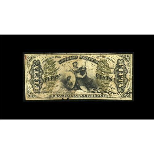 <B>Fr. 135? Milton 3R50.7 50¢ Third Issue Justice About New, Damaged.</B></I> This is the O'Mara Specimen and it was sold by us once before, when we offered the definitive Friedberg Collection in January of 1997. It was described there, "This enigmatic note was always considered by Milt to be the most significant Regular Issue note in his collection. It traces its history back to the S.H.&H. Chapman February 15, 1904 sale of the Wilcox Collection where it was lot # 906. It was described there, '50¢ parchment fibre (sic) paper, autographed signatures of Allison-Spinner, rev. S-2-6-4, carmine back. Water has seriously damaged the signature of John Allison, making it blurred and staining the note around it, exceedingly rare.' At the time the Encyclopedia was printed, this note was known to Milt and had been examined by him, but he was not successful in acquiring it until the early 1980's. The signature is seriously blurred, but it clearly appears to be that of John Allison. Should the note prove genuine, as Milt is sure it is, it indeed would be the most significant regular-issue Fractional note. Other experts, including Martin Gengerke, are of the opinion the note is a pre-1904 forgery. It's possible that both Milt's and Martin's opinion are somewhat colored by ownership. Milt owns it; Martin doesn't. This cataloger, lacking the ability to obtain physical evidence to either verify or refute its authenticity, is honestly unable to offer a meaningful opinion." Everything stated above remains true today, except for its ownership; it now belongs to the person who acquired it at the Tom O'Mara Sale. Tom thought enough of it to buy it for a four-figure price. As with its last auction appearance, CAA cannot guarantee the authenticity of this note, and will not accept returns. Offered without estimate.
