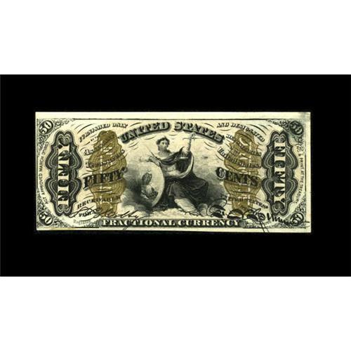 <B>Fr. 1350 50c Third Issue Justice Choice New.</B></I> The embossing and bronzing on this note are second to none. There is a small spot at lower left along with a press operator's fingerprint at upper left.<BR><BR><b>Shipping:</b> Coins & Currency (<a target="_blank" href="http://www.heritageauctions.com/common/shipping.php">view shipping information</a>)