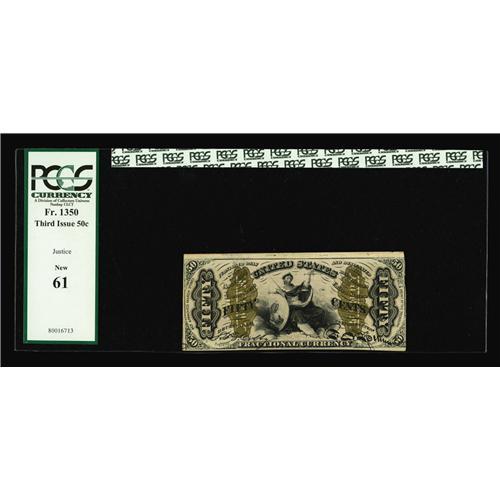<B>Fr. 1350 50c Third Issue Justice PCGS New 61.</B></I> Strictly original Justices are tough to come by in any grade.