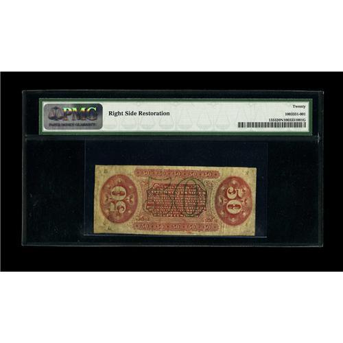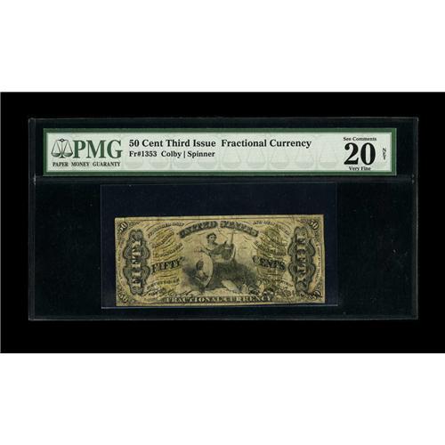<B>Fr. 1353 50c Third Issue Justice PMG Net Very Fine 20 Right Side Restoration.</B></I> This major rarity Fractional number faces-up very nicely, but the right one-fourth inch has been restored by the careful use of pieces from another Justice note. The work has been extremely well done and is only detectable under very close examination. When the Milt Friedberg Encyclopedia was written, only three pieces were known, including one which was severely damaged. In the intervening time a few more have surfaced bringing the census up to nine. Very few Fractional collectors will ever have the opportunity of owning a Fr. 1353 and this note deserves to receive considerable bidder attention. This particular example sold for close to $5,000 in 2003 and should bring that much and more in today's more sophisticated market.<BR><BR><b>Shipping:</b> Coin/Currency (<a target="_blank" href="http://www.heritageauctions.com/common/shipping.php">view shipping information</a>)