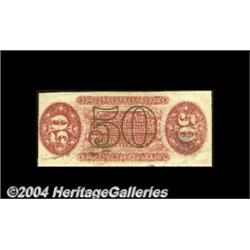 Fr. 1355 50c Third Issue Justice Choice New. Tight at the right, but an otherwise lovely example of this hand-signed Red Back Justice, with deep, original embossing, bold signatures and good color. <BR><BR><B>Important notice:</B> Heritage usually auctions material at the rate of 200-250 lots per hour. On some occasions eBay Live bid software or the Internet may not be able to keep up with the pace of the auction. We recommend placing a realistic absentee bid now as insurance to avoid disappointment. Occasionally the auctioneer may eliminate or reject an eBay Live bid, and the auctioneer may also reopen a lot after the close of the eBay live bidding (usually because we missed an audience bid), and may reject your bid even if it shows you as the winning bidder. By bidding via eBay Live, you agree that Heritage may award the lot to another bidder at its sole discretion under the circumstances described above or any other reasonable circumstances. Since eBay bids are not shown to us until we open the lot on the floor, we treat those bids just like floor bids. In most cases the floor responds before the eBay bid is presented to us, due to Internet lag time, so for consistency we have made it a policy that floor bids are always considered first over tie eBay live bids. Also please note that all Heritage lots purchased through eBay Live carry a 20% Buyer's Premium. Please make sure you read the Terms and Conditions before you bid. <BR><BR><B>IMPORTANT ANNOUNCEMENT ABOUT RESERVES:</B> Heritage now divulges all reserves on its web site 7 days before every auction. If you want to know whether the reserve on this lot has been met, and if not, what the reserve amount is, please visit this lot page on the HeritageCoin.com web site, or email: bid@HeritageGalleries.com