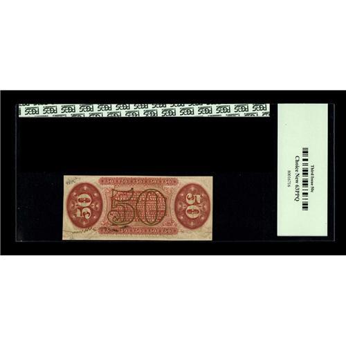 <B>Fr. 1355 50c Third Issue Justice PCGS Choice New 63PPQ.</B></I> The colors and signatures are bold on this issue that is not strong on margins. The golden overprint is bold and adds to the overall eye appeal.<BR><BR><b>Shipping:</b> Coin/Currency (<a target="_blank" href="http://www.heritageauctions.com/common/shipping.php">view shipping information</a>)