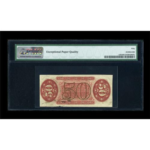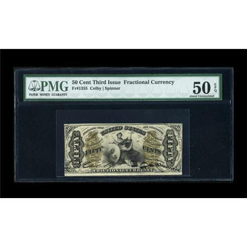 <B>Fr. 1355 50c Third Issue Justice PMG About Uncirculated 50 EPQ.</B></I> Bold bronzing on this Colby and Spinner signed issue.<BR><BR><b>Shipping:</b> Coins & Currency (<a target="_blank" href="http://www.heritageauctions.com/common/shipping.php">view shipping information</a>)