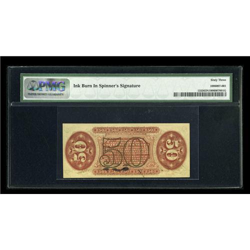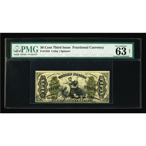 <B>Fr. 1355 50c Third Issue Justice PMG Choice Uncirculated 63.</B></I> PMG has assigned a "net" grade with the additional observation, "Ink Burn In Spinner's Signature," a challenge quite frequently encountered in these hand signed notes.