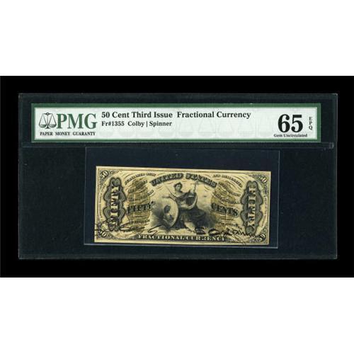 <B>Fr. 1355 50c Third Issue Justice PMG Gem Uncirculated 65 EPQ.</B></I> A cursory glance through auction archives makes one realize the scarcity of this issue at this grade level.<BR><BR><b>Shipping:</b> Coins & Currency (<a target="_blank" href="http://www.heritageauctions.com/common/shipping.php">view shipping information</a>)