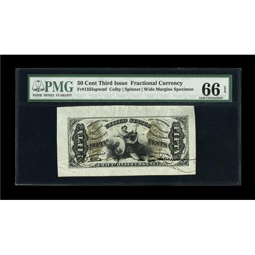 <B>Fr. 1355SP 50¢ Third Issue Wide Margin Face Justice PMG Gem Uncirculated 66 EPQ.</B></I> Unlike the majority of hand-signed Specimens on CSA paper, the ink has not cracked. Because of this tendency, few of these will ever receive this EPQ designation. Scarce and undervalued in this grade.<BR><BR><b>Shipping:</b> Coins & Currency (<a target="_blank" href="http://www.heritageauctions.com/common/shipping.php">view shipping information</a>)