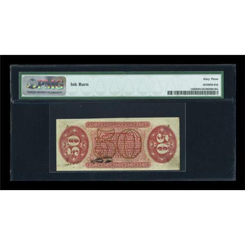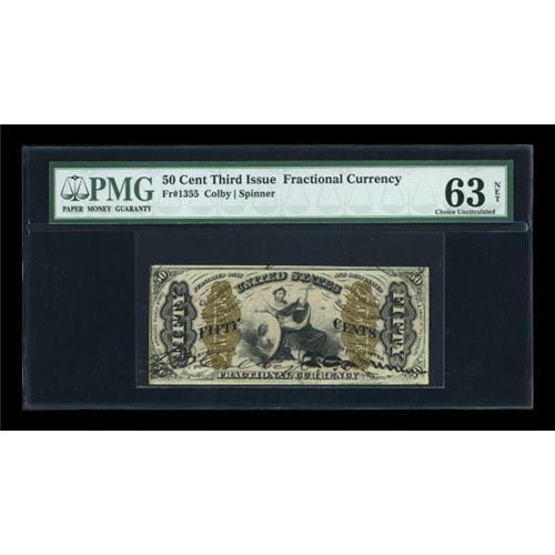 <B>Fr. 1356 50c Third Issue Justice PMG Choice Uncirculated 63 NET.</B></I> PMG has commented, "Ink Burn," and they are indeed correct, as parts of the broad Spinner pen strokes have eaten away the paper and fallen out. They were somewhat less correct with the Friedberg number; the holder says 1355, but the note is a 1356.<BR><BR><b>Shipping:</b> Coins & Currency (<a target="_blank" href="http://www.heritageauctions.com/common/shipping.php">view shipping information</a>)