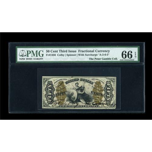 <B>Fr. 1356 50c Third Issue Justice PMG Gem Uncirculated 66 EPQ.</B></I> A gorgeous Justice example, with PMG concurring by designating this a 66 EPQ, which is the highest grade granted to date for this issue. A perfect note with which to build a high-end collection around.<BR><I>From The Peter Gamble Collection.</B></I><BR><BR><b>Shipping:</b> Coins & Currency (<a target="_blank" href="http://www.heritageauctions.com/common/shipping.php">view shipping information</a>)