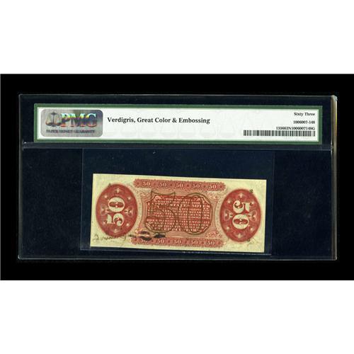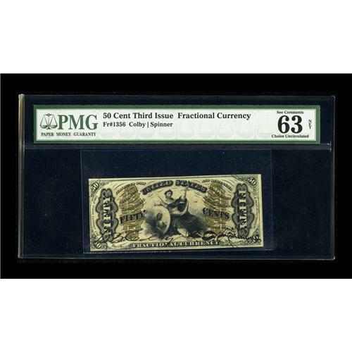 <B>Fr. 1356 50c Third Issue Justice PMG Net Choice Uncirculated 63.</B></I> This cataloger, who is well experienced in fractionals, cannot see any justification for the comment "Verdigris" but the comments "Great Color & Embossing" are easily warranted. Many of these hand signed notes have some ink erosion but this lovely example has not been hindered by any faults.<BR><BR><b>Shipping:</b> Coin/Currency (<a target="_blank" href="http://www.heritageauctions.com/common/shipping.php">view shipping information</a>)