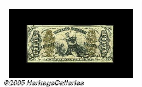 <B>Fr. 1356 Milton 3R50.4 50¢ Third Issue Justice Very Choice New.</B></I> The margins are typically very close in a few spots, but they never quite touch the frame line. This is a beautiful example of the hand-signed Red Back Justice type, with perfect color, deep, original embossing and bold, hand signatures. The back is perfectly centered.