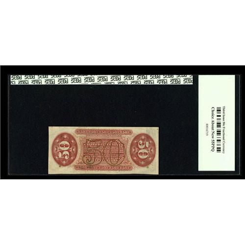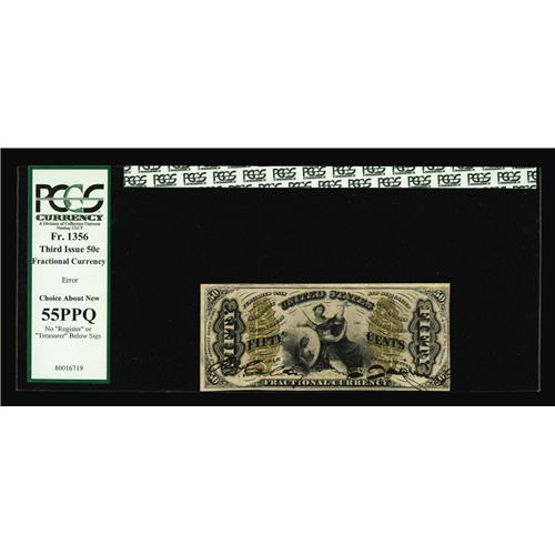 <B>Fr. 1356 Milton 3R50.4 50c Third Issue Justice PCGS Choice About New 55PPQ.</B></I> This is an extremely rare Fractional Error, where both Treasury officials have signed, but the words "Register" and "Treasurer," which should have been written by clerks on the note first, were neglected.